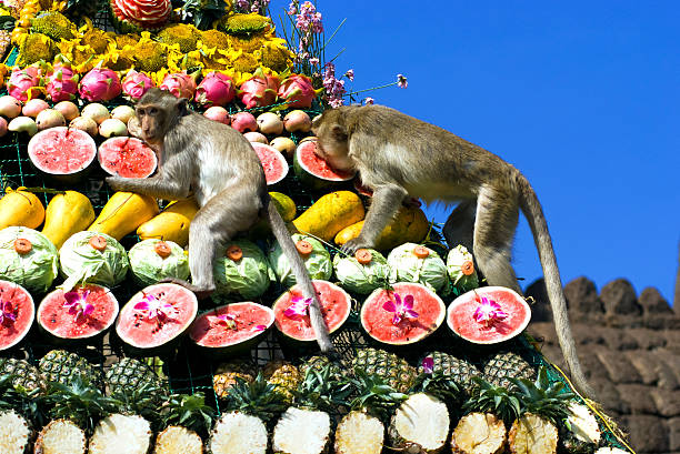 Na cidade de Lopburi, na Tailândia, acontece o Festival do Macaco, onde moradores oferecem toneladas de frutas e verduras para os animais da região.